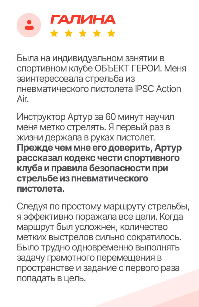 В клубе «Объект ГЕРОИ» участник осваивает базовый курс безопасного и квалифицированного обращения с оружием под руководством опытных инструкторов.